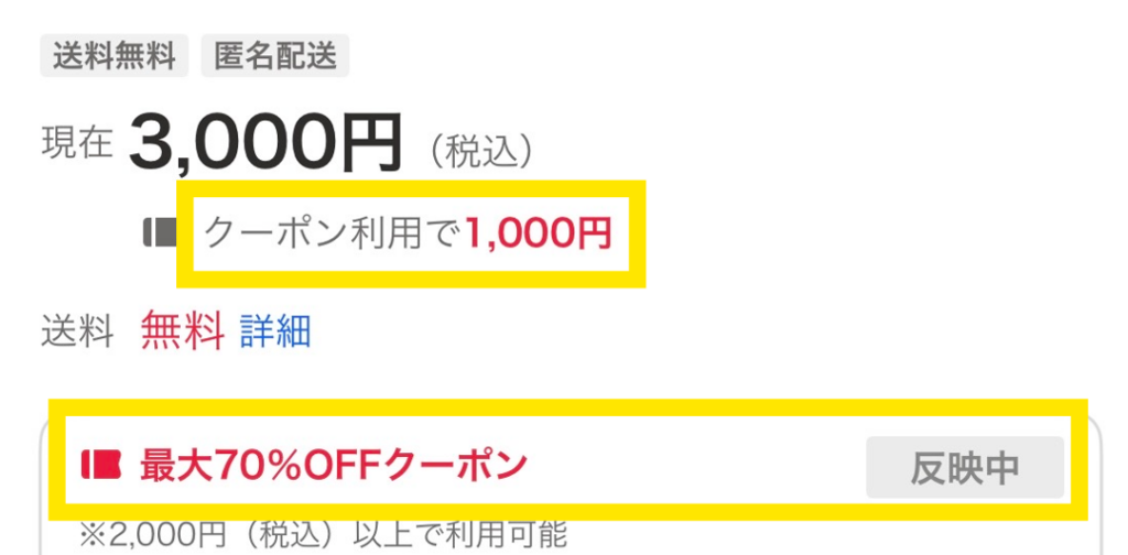 下記の場合、70%オフクーポンを使って2000円値引きになり、1000円で購入できるということが確認できます